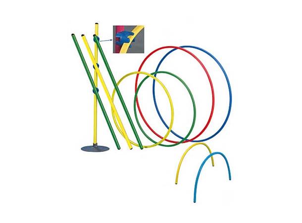 Det består av: • 3 ringer i hver utførelse (50, 60, 70, 80 cm) • 12 halve ringer • 24 turnstaver • 24 føtter • 24 stav- og ringholdere.